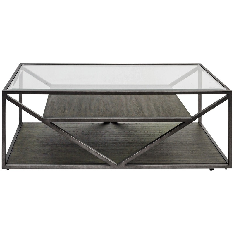 Flaunt your sense of style with the Arista cocktail table as part of your urban loft or industrial home. This table is all angular metal tubing and glass, with two ash veneer wooden shelves. The top is made of beveled tempered glass and the bottom shelf is