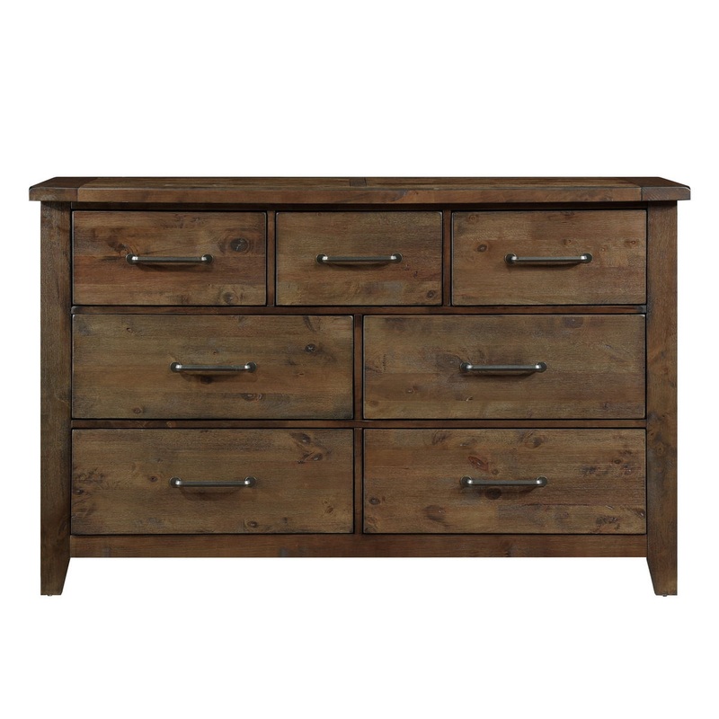 Classic transitional design serves as a base for the natural qualities of the solid wood utilized to create the rustic look of the Jerrick Collection. Metal hardware furthers the authentic rustic look of the dresser while a burnished finish serves to highl