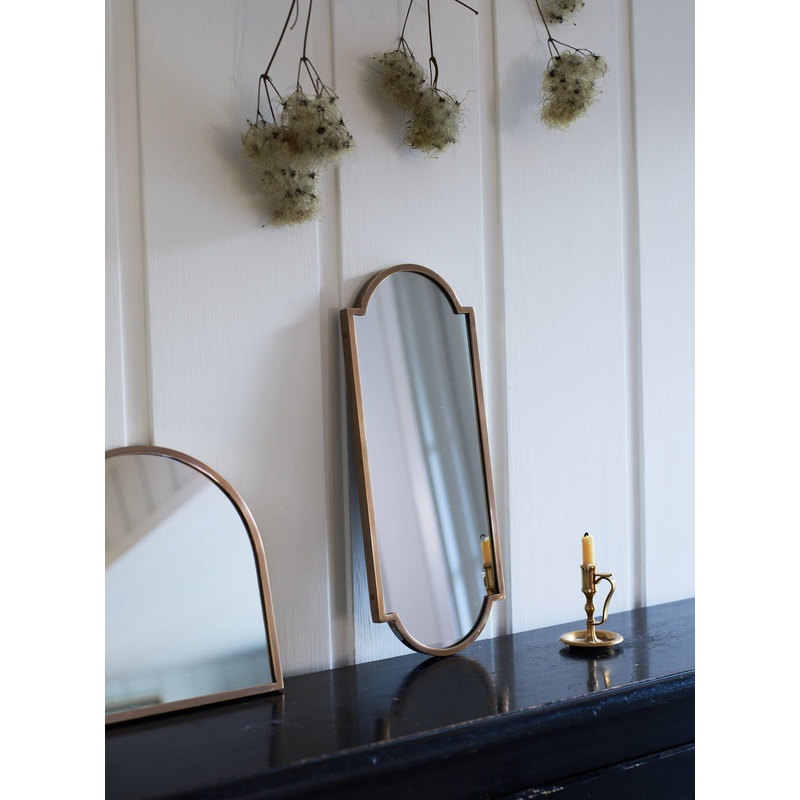 - A small, simple metal-framed mirror- Crafted from brass- Designed to be wall-hung, but can be propped up if preferred- Use in silo or scattered amongst other shapes to maximise the light